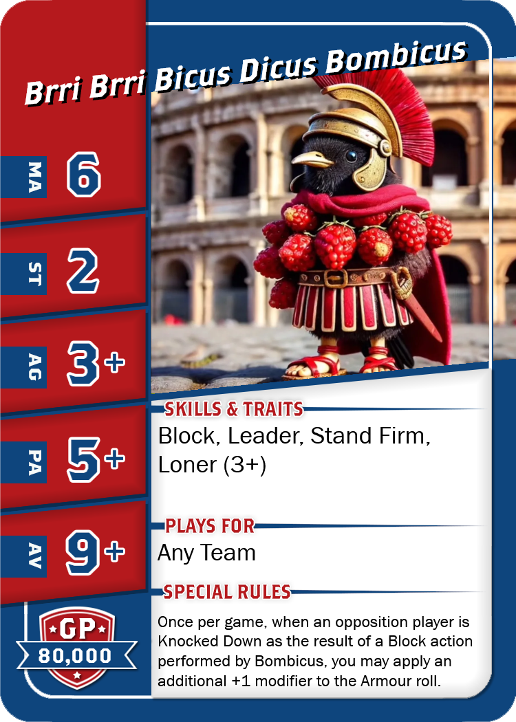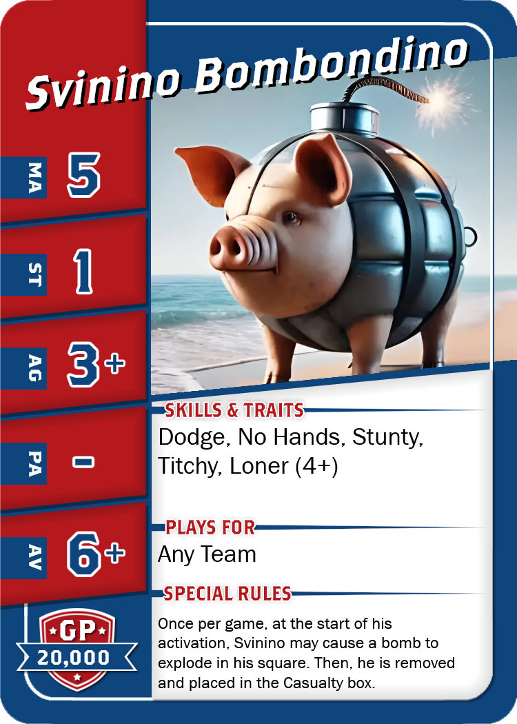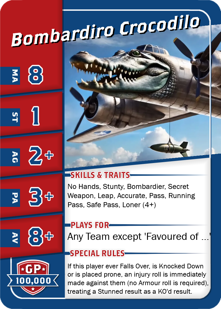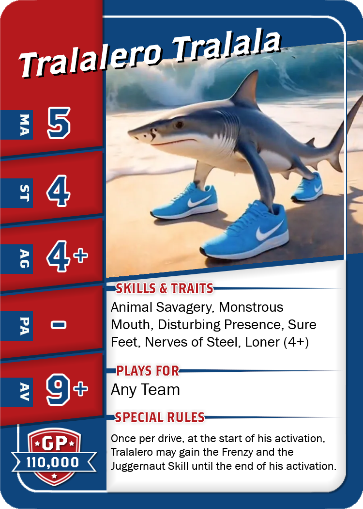 House Rules Italian Brainrot Starplayers: New italian Starpalyers for Blood Bowl 2020 Starplayer Card - Bombardiro Crocodilo Starplayer Card - Brri Brri Bicus Dicus Bombicus Starplayer Card - Svinino Bombondino Starplayer Card - Tralalero Tralala 40K meets Blood Bowl: New darkgrim Teams for Blood Bowl 2020 Space Marine Team Roster Genestealer Hybrid Team Roster